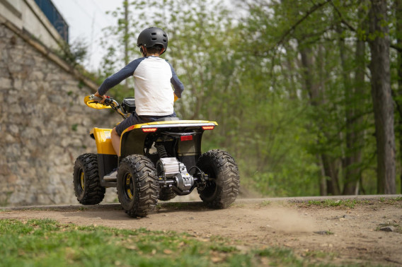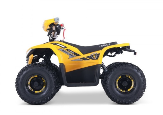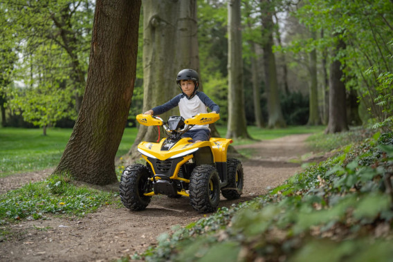 Le quad électrique eBumbleBee ATV60M est déjà conçu pour une catégorie d'âge plus large des jeunes. Il s'adresse spécifiquement aux enfants et adolescents âgés de 7 à 18 ans (de 130 cm à 170 cm) et pesant jusqu'à 75 kg. En fait, il peut aussi être une source de plaisir pour les jeunes adultes. Il a un design extérieur robuste en jaune-noir qui rappelle un bourdon. Grâce à son double feu avant à DEL et à ses feux de freinage arrière, vous pourrez même rouler le soir. Les dimensions de 128 × 83 × 84 cm indiquent qu'il faut avoir un coffre un peu plus grand pour le transporter. Il est équipé d'un moteur électrique silencieux de 750 W avec différentiel qui permet aux roues d'un même essieu de tourner à des vitesses différentes. Cela rend la conduite beaucoup plus stable et plus sûre lors des virages à grande vitesse. Le grand écran couleur LCD est tout aussi impressionnant. Il complète agréablement le design général du quad et affiche toutes les informations nécessaires concernant la conduite. Il dispose de deux ports USB-A qui vous permettent de recharger le portable ou l'appareil photo pendant le trajet.