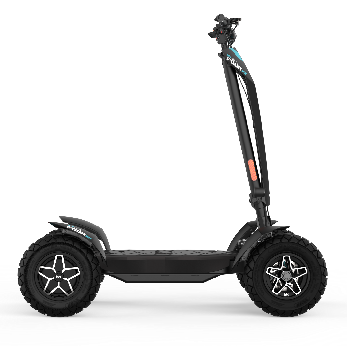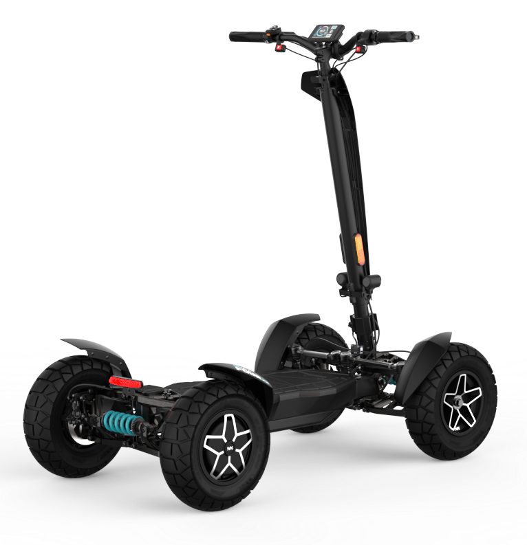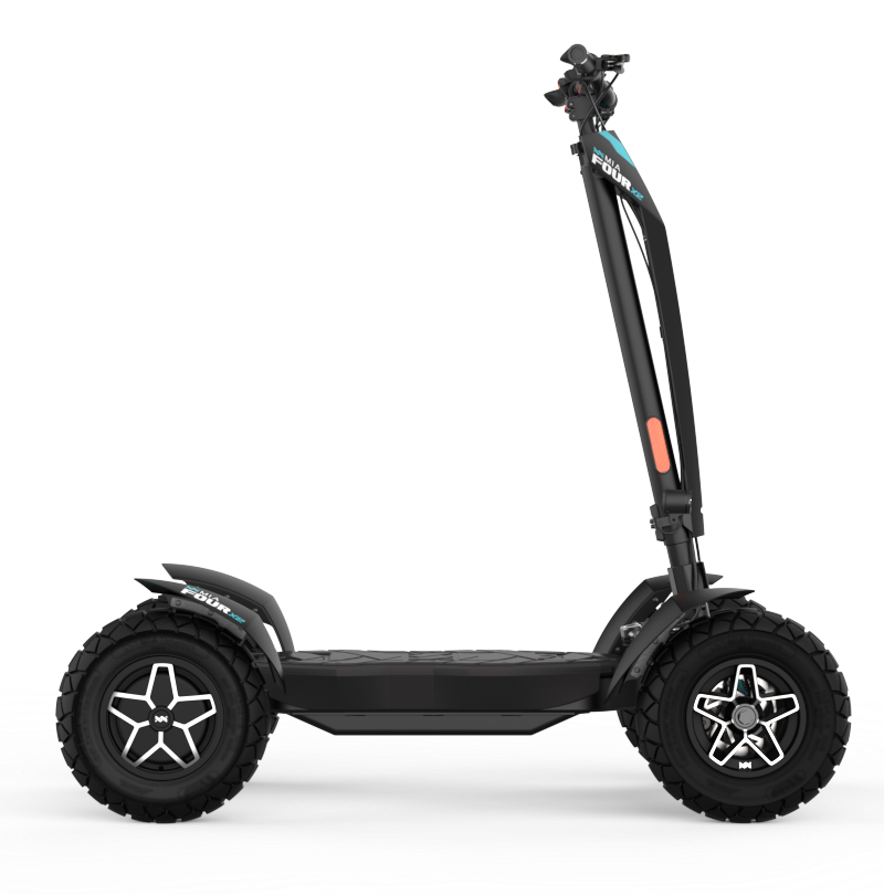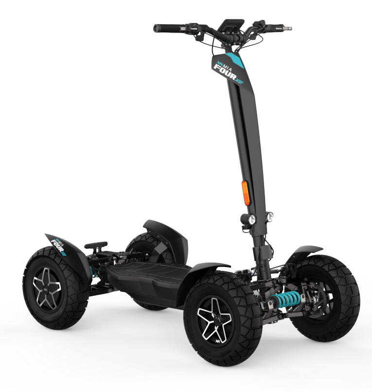 La puissante trottinette électrique MIA FOUR X2 avec transmission 4x2, une puissance allant jusqu’à 7 200 W, une autonomie de 100 km et une stabilité maximale grâce aux quatre roues.