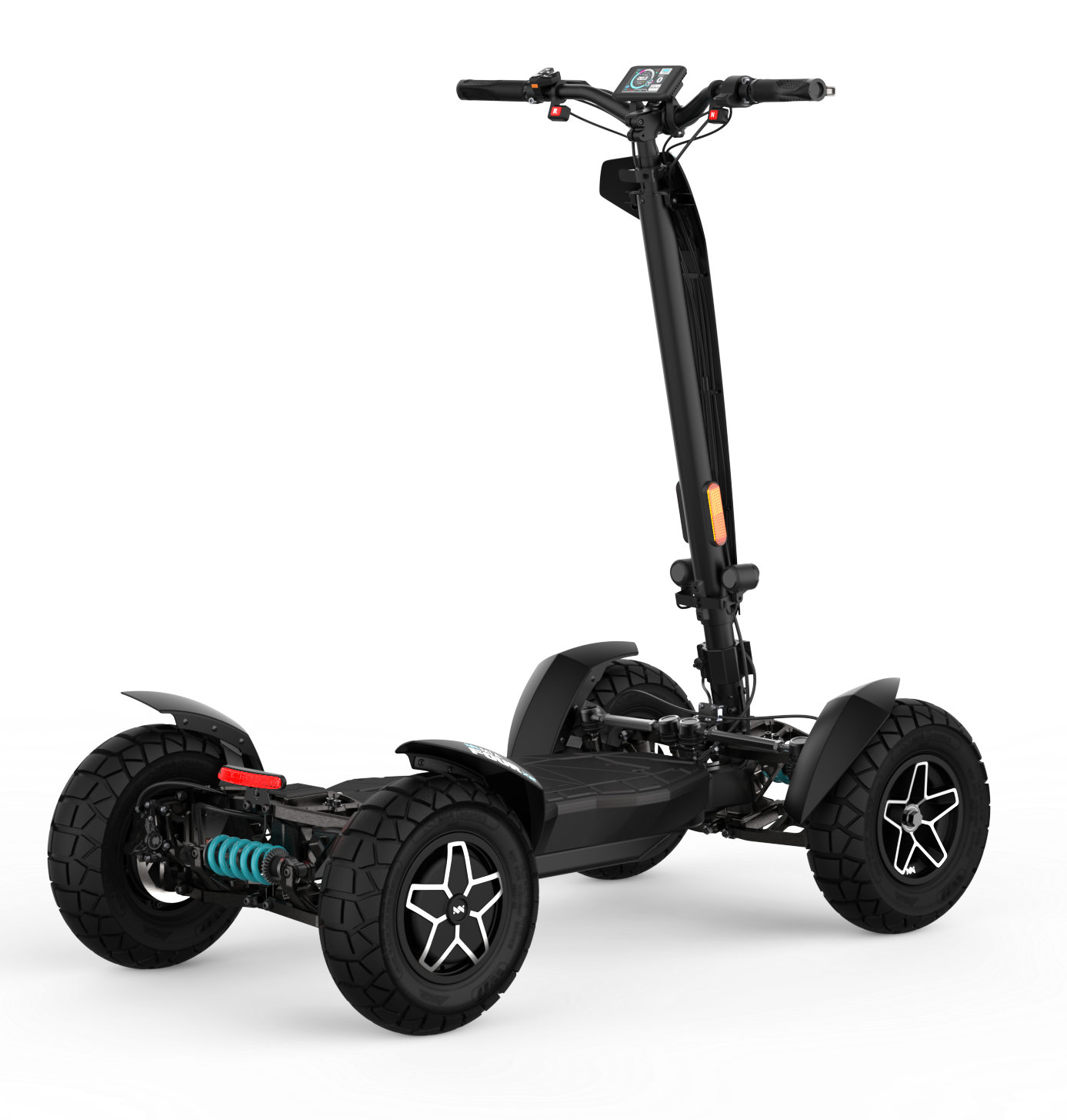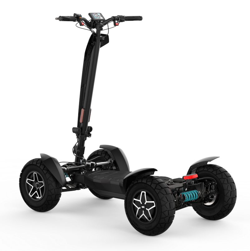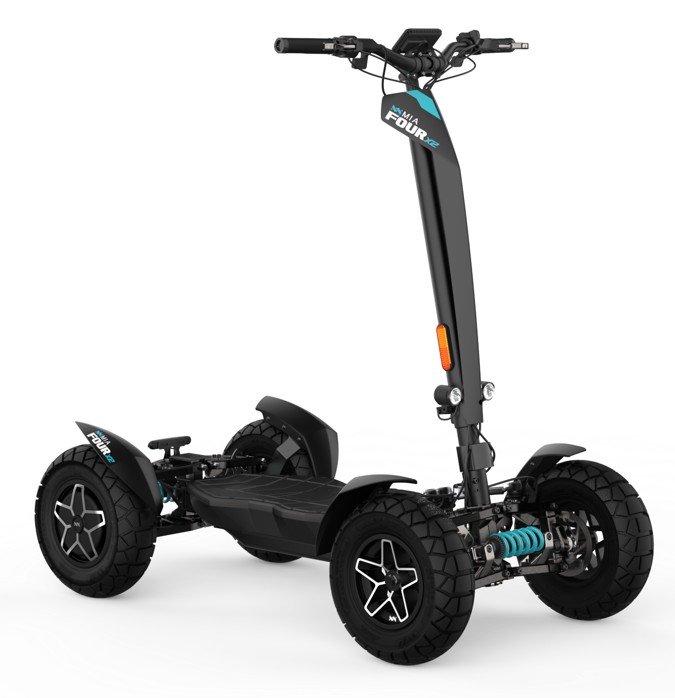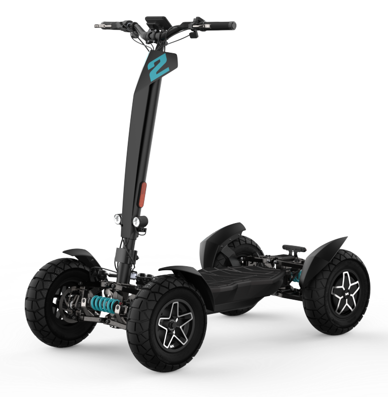 La puissante trottinette électrique MIA FOUR X2 avec transmission 4x2, une puissance allant jusqu’à 7 200 W, une autonomie de 100 km et une stabilité maximale grâce aux quatre roues.