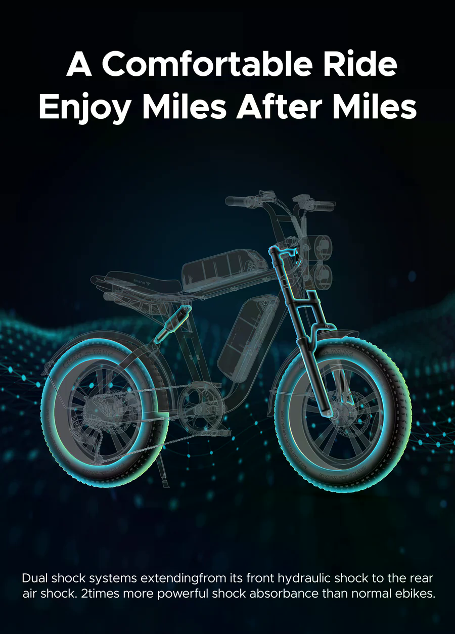 Le design de l’ENGWE M20 est l’un de ses principaux atouts. Il associe une apparence de moto rétro à des technologies e-bike modernes et à une construction de cadre robuste. Le cadre est fabriqué en alliage d’aluminium 6061 durable, capable de supporter des charges élevées, des chocs et une utilisation prolongée dans diverses conditions. Alors que la plupart des e-bikes urbains misent sur un design minimaliste et léger, la M20 privilégie une sensation de solidité, de stabilité et un caractère motocycliste affirmé. Les dimensions du vélo sont de 167 cm de longueur, 114 cm de hauteur, 37 cm de reach, 115,2 cm d’empattement et 76,2 cm de hauteur de cadre, offrant une position de conduite confortable pour la majorité des utilisateurs. Un avantage majeur est la possibilité d’installer une seconde batterie intégrée dans le cadre, renforçant encore l’esthétique moto du vélo. L’équipement est complété par une fourche hydraulique avant associée à des amortisseurs arrière à air, faisant de ce modèle un e-bike entièrement suspendu, adapté également aux routes accidentées. Le puissant phare avant à LED assure un excellent éclairage, les pneus fat 20×4.0" garantissent une traction et une stabilité optimales, tandis que les freins à disque mécaniques de 160 mm à l’avant et à l’arrière offrent un freinage fiable. Un autre avantage est la transmission à 7 vitesses, permettant d’adapter facilement le style de conduite aux différentes conditions.