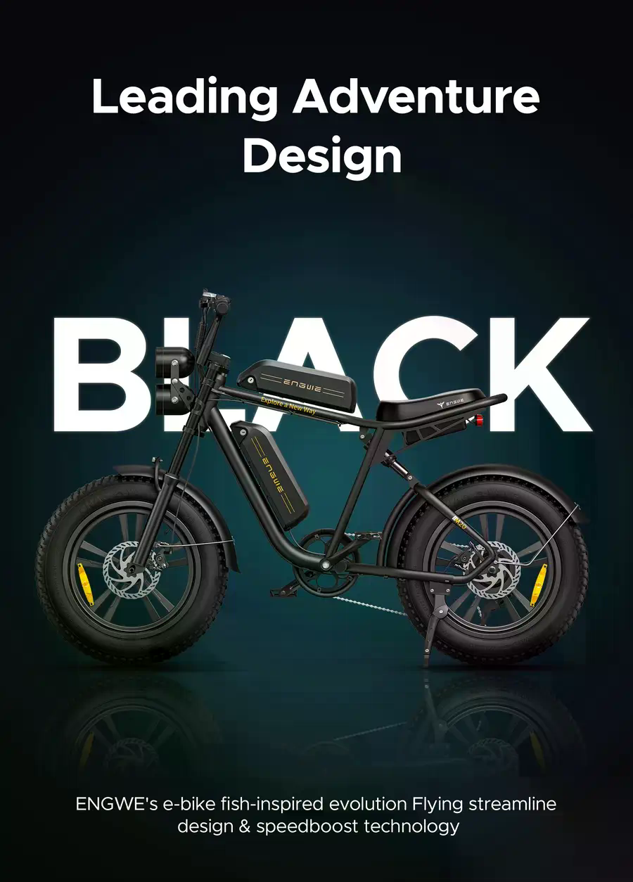 ENGWE M20 – vélo électrique puissant avec moteur de 750 W (1000 W en crête), batterie de 48 V / 13 Ah (624 Wh), autonomie de 75 à 150 km, vitesse maximale de 45 km/h, suspension complète et pneus fat 20×4.0. Idéal pour la ville comme pour le tout-terrain.