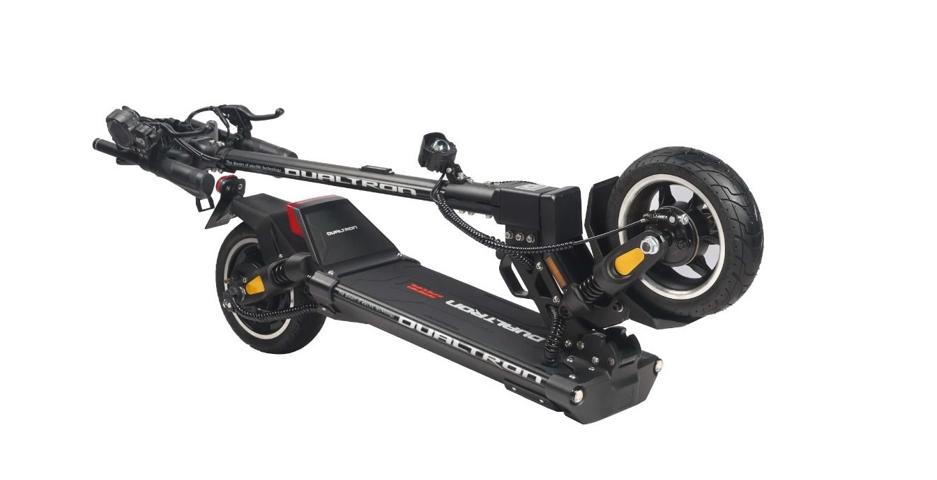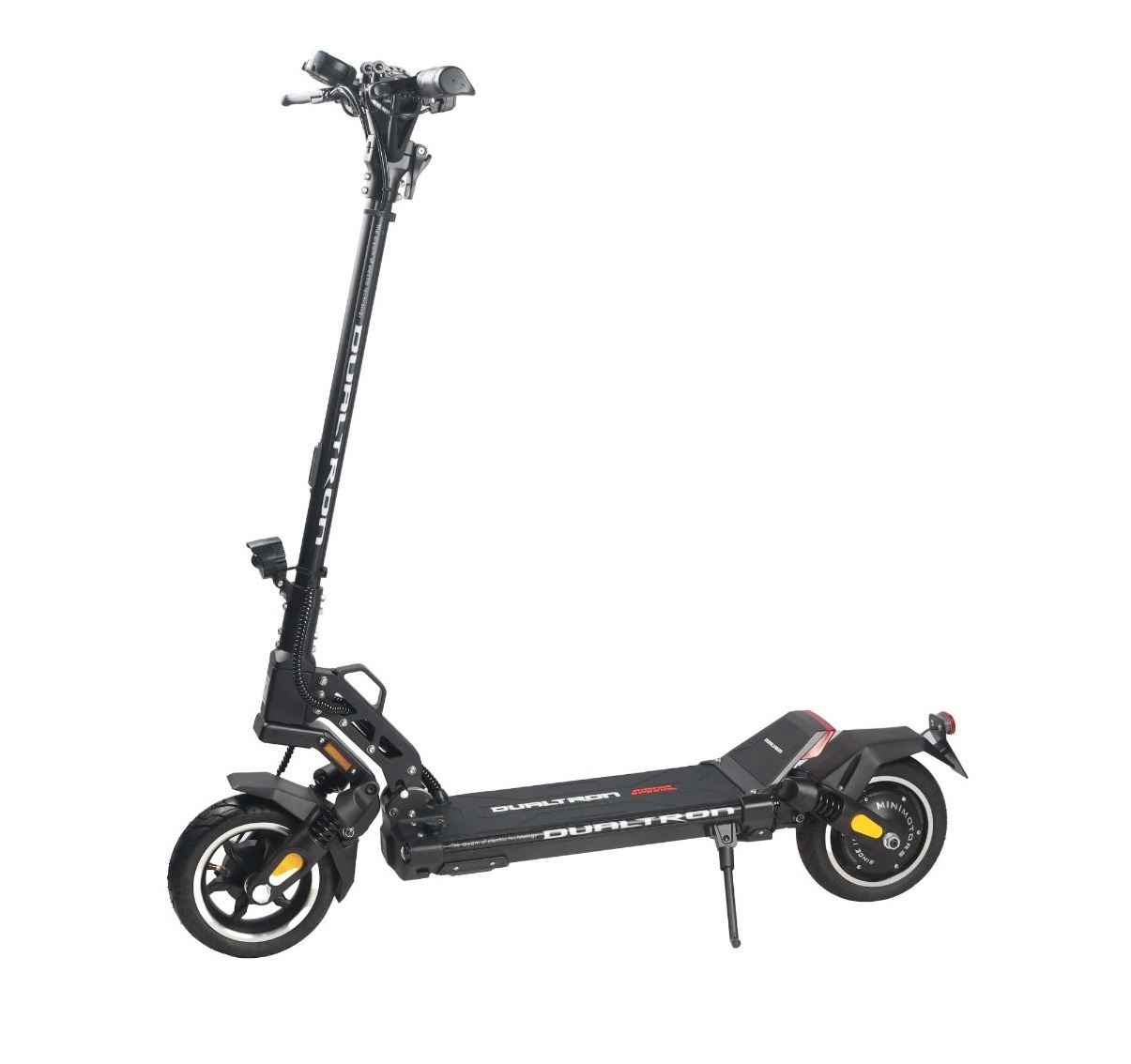 Dualtron Aminia Special / Long Body (2025) – trottinette électrique urbaine haute performance avec guidon pliable, configuration double moteur (Long Body), batterie 52 V (15,6 Ah ou 21 Ah Samsung), autonomie jusqu’à 65 km, vitesse maximale de 65 km/h, poids d’environ 30 kg, idéale pour les excursions et l’utilisation quotidienne.