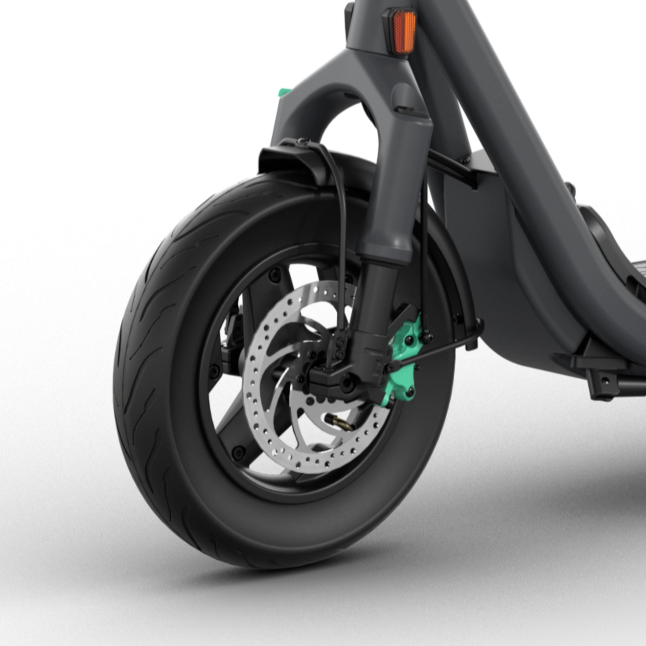 La sécurité de l’Egret GT est à un niveau extrêmement élevé. Le contrôle maximal en conduite est assuré par des freins à disque hydrauliques avec disques de 160 mm, offrant un freinage stable, précis et immédiat. Les pneus de 13" garantissent un excellent contact avec la surface et une distance de freinage plus courte. L’éclairage est traité de manière professionnelle – phare LED OSRAM 80 lux, LED arrière avec fonction feu stop et clignotants intégrés augmentent considérablement la visibilité de nuit et par mauvais temps. Le cadre est conçu pour supporter une charge de 150 kg sans perte de stabilité. La sécurité électronique est assurée par le déverrouillage NFC, l’alarme et l’immobilizer, qui protègent la trottinette à chaque stationnement. La fonction Apple Find My permet un suivi constant de la position de l’appareil, réduisant fortement le risque de vol. L’étanchéité IPX5 permet de rouler même sous la pluie, tandis que la batterie certifiée IPX7 résiste même à une immersion temporaire dans l’eau. Grâce au couple de 62 Nm, l’accélération est immédiate et sûre même dans des conditions difficiles.