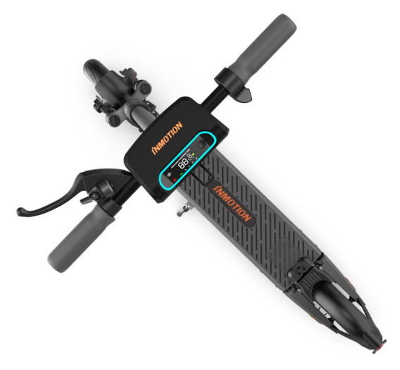 Bien que ce soit une trottinette urbaine, vous remarquerez la construction robuste et solide de l'InMotion S1F dès le premier coup d'œil. L'intention était de construire une trottinette durable qui puisse résister à une utilisation intense. C'est pourquoi le fabricant s'est appuyé sur la rigidité éprouvée du cadre en aluminium aérospatial. La trottinette offre un espace pour les jambes supérieur à celui de sa catégorie, la plateforme mesurant 65 cm de long et jusqu'à 17 cm de large, le tout recouvert d'une surface en caoutchouc pratique et antidérapante. Le cadre se poursuit à travers le col de la barre de direction jusqu'à le joint avec un système de pliage simple. Il suffit de débloquer la barre par un levier et de la fixer au garde-boue arrière à l'aide du crochet intégré. Vous ne serez même pas gêné par les câbles, puisqu'ils passent du joint de pliage à l'intérieur de la barre. Le guidon est dominé par un large écran LCD intégré. Vous y trouverez la vitesse actuelle, les indicateurs de feux et de clignotants, ainsi qu'un indicateur des trois modes de conduite. Tout cela est contrôlé soit par un simple bouton à côté de l'écran, soit par le smartphone après avoir connecté la trottinette via Bluetooth. En termes de design, la combinaison de couleurs traditionnelle d'InMotion - noir mat avec des détails orange - est incontournable.