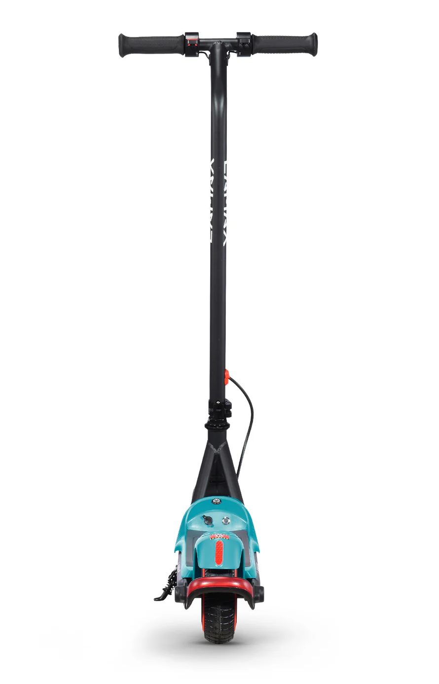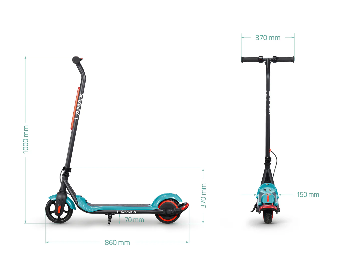 Le LAMAX eFlash SC20 attire l’attention dès le premier regard grâce à son design attrayant associant noir et turquoise, qui paraît frais et sportif. La trottinette a des dimensions compactes de 88 × 100 × 37 cm lorsqu’elle est dépliée, ce qui la rend adaptée aux enfants et pratique à transporter ou à ranger. La structure en acier est solide et résistante, mais en même temps légère, de sorte qu’un enfant peut soulever ou déplacer la trottinette. Les roues de 6,5 pouces sont fabriquées en matériau perforé résistant, éliminant le risque de crevaison et ne nécessitant aucun entretien, contrairement aux pneus gonflables. La trottinette offre un éclairage LED à l’avant pour améliorer la visibilité en cas de faible luminosité, ainsi qu’un feu stop arrière qui avertit les autres lorsque l’enfant ralentit. Une fonction pratique est le mécanisme de pliage du guidon, qui permet un rangement rapide et facile. Le système de sécurité « zero-start » garantit que la trottinette ne démarre pas toute seule : le moteur ne s’active qu’après une impulsion au pied, ce qui est plus sûr pour les enfants. Le tableau de bord dispose d’un indicateur LED de la batterie qui indique clairement quand il est nécessaire de recharger. Le coffret comprend tout ce dont vous avez besoin : la trottinette, le chargeur, un jeu de vis, des outils et le manuel. Grâce à cet équipement complet, les enfants peuvent commencer à rouler immédiatement et les parents sont assurés de ne rien oublier.