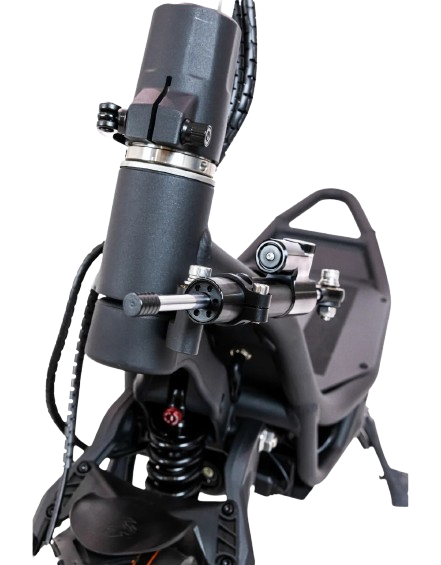 L'alpha et l'oméga de la construction de la NAMI Burn-E 3 Max est le squelette en aluminium aérospatial monobloc. Les concepteurs l'ont soudé à la main, ce qui donne un cadre rigide et durable. Il commence au niveau de la poignée arrière pour un transport confortable, se poursuit par une large et solide plateforme antidérapante jusqu'à la barre de direction. Celle-ci est la seule à être réalisée en fibre de carbone. Elle peut donc supporter des charges jusqu'à 400 kg, tout en libérant l'ensemble de la structure d'un poids excessif. Un joint breveté en acier inoxydable relie la barre à la structure métallique. Pour plier la trottinette, il faut la desserrer, dévisser le filetage conique, puis sortir la barre et la replier.
