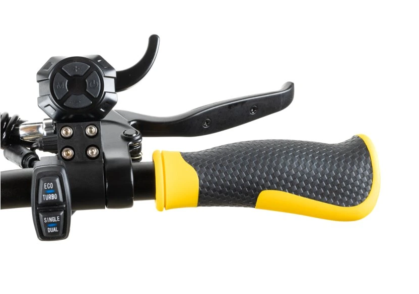 La Teverun Blade Mini Ultra conserve les dimensions compactes du modèle de la gamme Blade Mini, mais se démarque par son design – la combinaison noir-jaune est dynamique et attire le regard en ville. Le guidon intègre un écran LCD avec lecteur NFC – sans modules externes – ce qui lui confère un aspect propre et clair. L’écran permet d'allumer/éteindre la trottinette à l'aide d'une télécommande, affiche la vitesse, l’état de la batterie et permet le réglage des modes de conduite via l’application mobile. Le confort est renforcé par des pneus à chambre de 10" combinés à des amortisseurs à ressorts encapsulés et un bras oscillant, qui atténuent efficacement les irrégularités des routes urbaines. La gâchette d’accélérateur au pouce, associée au panneau de commande, offre un contrôle précis de la conduite. Dans l’ensemble, la Blade Mini Ultra est un véhicule soigneusement pensé, richement équipé et au design marquant.
